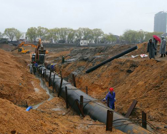 1.溝槽開挖 溝槽底寬應按下式計:B=D1+2(b1+b2) 式中:B—管道溝槽底部的開挖寬度(mm) D1—管道結構的外緣寬度(mm) b1—管道一側的工作面寬度(mm) b2—管道一側的支撐寬度(mm) 2.溝槽支撐 根據溝槽土質、地下水、開槽斷面、荷載條件等因素進行設計,要求牢固可靠,防止塌方、支撐不得妨礙下管和穩管。 3. T型接口管道在垂直或水平方向轉彎處應設支墩。應根據管徑、轉角、工作壓力等因素經計算確定支墩尺寸。 4.輸送生活飲用水時,管道不應穿過毒物污染區,如穿過時應采取防護措施。 5.凡承插連接的球墨鑄鐵管線,經計算設支墩,參見國家建筑標 準設計圖集03SS505《柔性接口給水管道支墩》。 6.球墨鑄鐵管的外防腐蝕涂層應根據敷管地的土質情況來選擇鍍鋅和環氧瀝青涂層或更高要求的涂層。 7. 管道安裝完、試壓合格后,宜用低氯離子水沖洗和0.03%高錳酸鉀水溶液消毒。